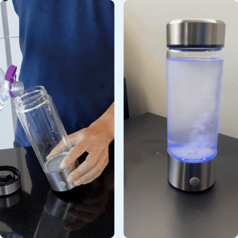 Fill your hydrogen water bottle with filtered or mineral water. Press the button and wait 2–3 minutes until you hear a beep — that means your hydrogen water is ready.