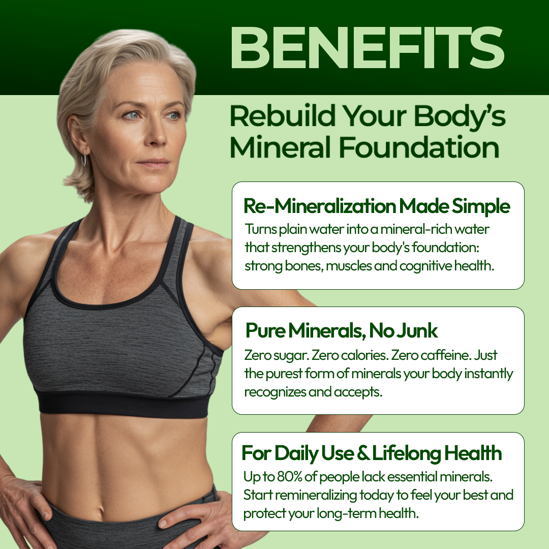 Most people live in a state of hidden mineral depletion without even knowing it. When your body lacks the essential minerals it was built to run on, your muscles fatigue faster, your bones weaken and your mind feels foggy. Re-mineralizing restores that foundation — rebuilding strength, energy, and balance from the inside out.